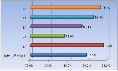 從上圖可以看出,游客對門票的滿意度整體較高,5A、4A、1A的滿意度均在90%以上,3A、2A略低,約85%左右。