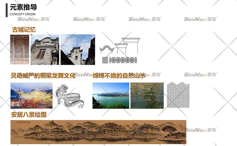 基于自然、歷史、文化、色彩等設計理念,我們對安居古鎮(zhèn)的核心特色進行分析,提取相關視覺元素,形成了自己設計思路。