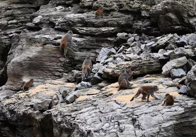 5月26日,野生獼猴在小三峽的猴糧投放點進食